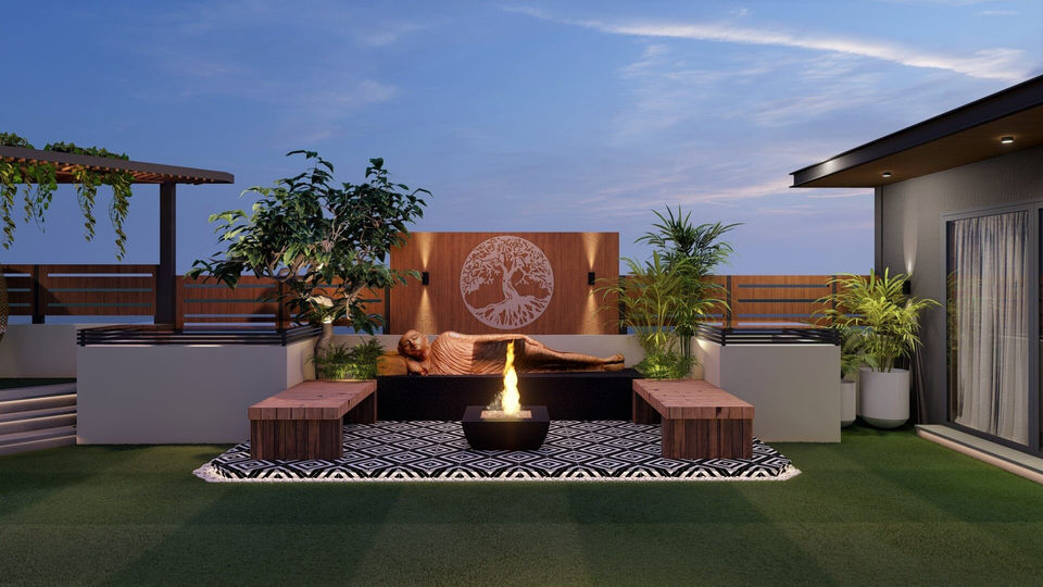 This design of a modern terrace gave us the opportunity to choose design ideas from a large variety of trends. The Bar area is designed to enjoy a breezy evening with friends or soak up some fresh sunshine during the day. The terrace decorates beautifully with different greenery elements. The outdoor living area is perfect for relaxing and entertaining. Intimate lighting gives the terrace style and class. Hidden surprises like Jacuzzi and geyser fountain connect the landscape to the comforta- ble. beach theme that blends with a simple yet modern aesthetic.