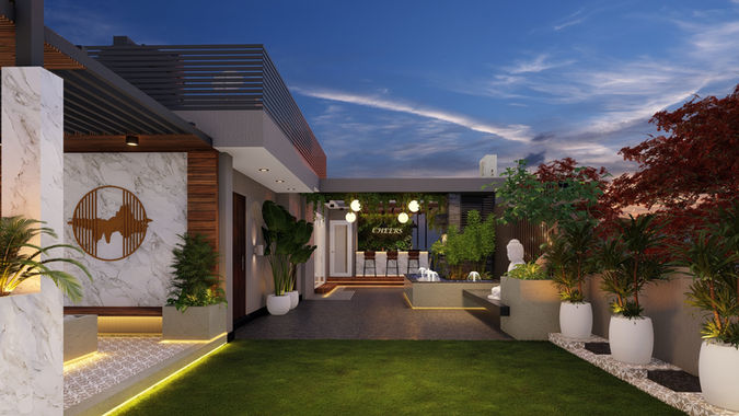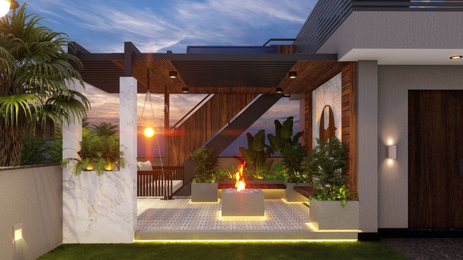 The terrace garden project is located in Sushant Lok, Gurugram, and the client, a pilot, wants to transform their terrace to spend quality time with their family. The client's clear requirements include a bar, covered seating for 10-12 people, a large water body, a pool table, open seating with a swing and fireplace, and a welcoming wall with a Buddha statue. The terrace will be beautified with different types of plants and outdoor lights to dramatically increase its beauty and ambiance. The project aims to create a luxurious and functional outdoor space that caters to the client's entertainment and relaxation needs, while also enhancing the aesthetic appeal of the terrace